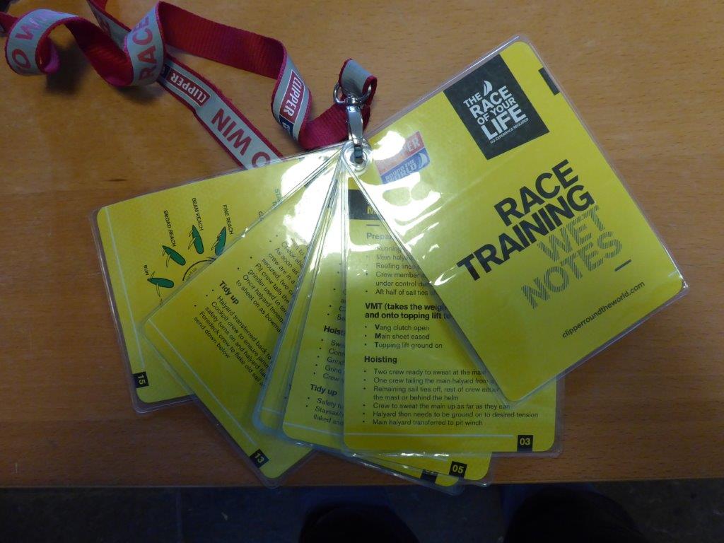 Yes, a bit of rope. With no knots. I could add pictures of knots but there are plenty on the net. However, it is a vital piece of kit for practicing with. On the theory side, there is a training manual of more than 80 pages. Week One is crewing skills, which means you become RYA Competent Crew and Week Two is Offshore Sailing and Life on-Board. For these two weeks you have wet cards (not necessarily the correct technical term) around your neck for quick reference.