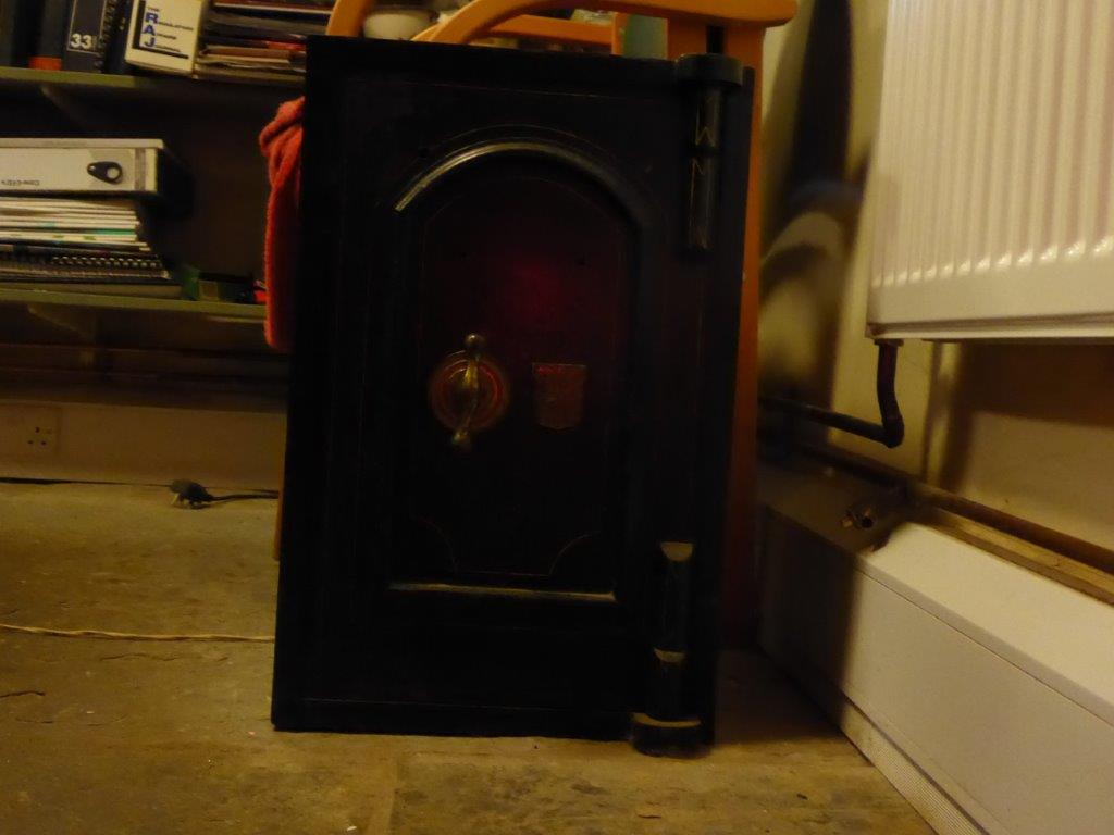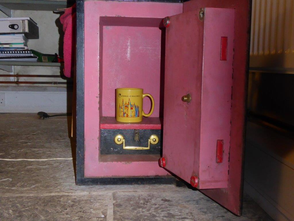 This belonged to my uncle. When he died, the care home asked me to clear his room out. They mentioned the safe and did I have a key? No? Well, we’ll get the handyman on standby with his drill and force it open in your presence. When I arrived, I tilted it to see how heavy it was and…the door swung open! Inside were a couple of Christmas cards and nothing else. To give an idea of its size, here it is with a coffee mug for scale: