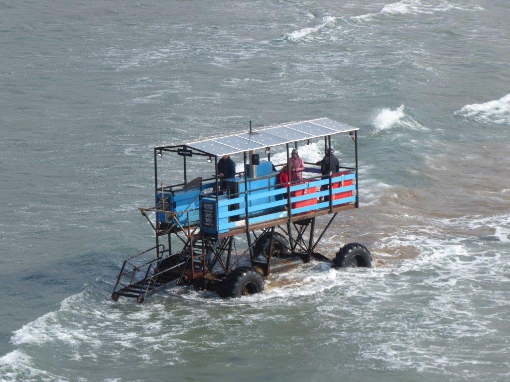 And at high tide it’s a totally different place, with a unique way of arriving, the Sea Tractor.