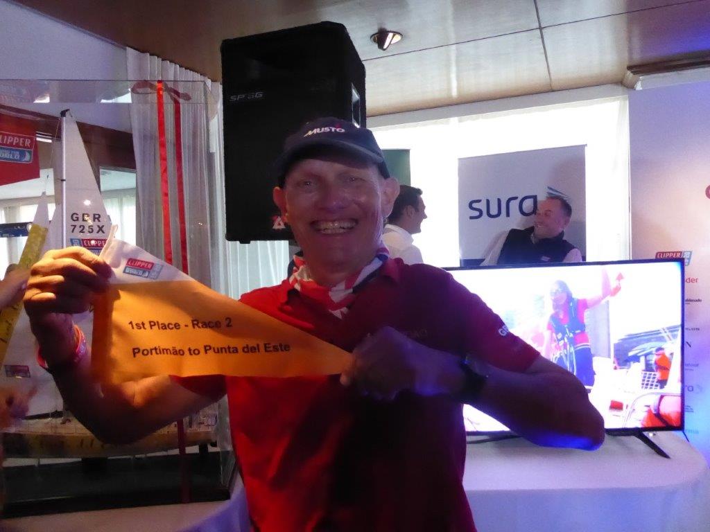 One of the crew on George’s boat, Qingdao, is Dr Martin Mills, known as Pip (I’m not sure why, must try to find out). He’s a doctor from Bristol and is sailing on the first two or three legs. George thought they might have people they know in common as they live relatively close. He asked Pip where he practiced, to be told Royal United Hospital Bath. Gosh, says George (or some such expression), I was born there. After a fair bit of discussion, it turns out that it is more than likely that Pip was the doctor who delivered George, as he was the only male registrar in that department at the time! Not only George, but another Qingdao crew member was operated on by Pip. We did wonder how they allocate crew to the different boats, is this a clue? A very small world. Here’s Pip looking gleeful with his 1st pennant from Race 2.