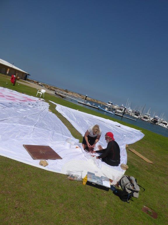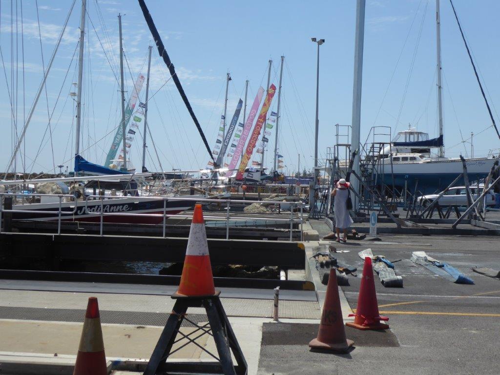 The Fremantle Sailing Club, where the yachts are berthed, is about 20 minutes’ walk from my hotel but not a walk I fancy in this heat. Instead, there’s a free bus on a circular route, every ten minutes, which I’ve been catching. On the first day I managed to lose my Musto cap and it’s not turned up in lost property. Cheryl bought me a lovely Perth cap which is almost as good. We shared a steak sandwich at the sailing club to celebrate the hat replacement: it was so big we still couldn’t eat it all. After that we walked it off by going to see the boats. Due to their draft (draught?) we’ve been told they cannot moor close to the sailing club, so it’s a good 15 minute walk through the boat yard (easy to get lost amongst all the boats), ironically towards the hotel. Unfortunately there’s a big fence in the way so we can’t take a short cut.