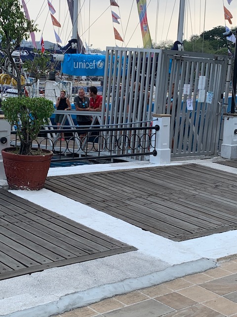 Later we found out that no-one was going to arrive to take their temperatures (on a Sunday) so a night on the boats in port. They were able to order beer and pizza so some semblance of a party. I forgot to say (if it needs saying) that prize giving is cancelled. I was awoken Monday morning (today) by Romeo (OK, JD) outside my balcony. The crew are being allowed to go to the shower block along the marina. A super yacht moored up (they seem to have full freedom) was blaring out pop music so once again no real communication. I was not compos mentis enough to get a photo so you’ll have to imagine the scene.