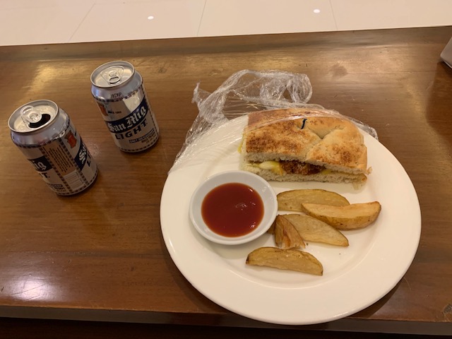 Meanwhile Becca and I had lunch in the lobby on our floor. Marginally better than breakfast, it was on a proper plate and with beer!