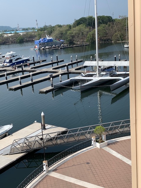 The next morning, we were at least allowed to visit each other (rooms next door and thankfully overlooking the marina). We could also walk around the third floor where the bedrooms are. Only three other guests were apparent. Breakfast was provided by the hotel restaurant: an omelette in a cardboard takeaway box with takeaway coffees in my room. We discovered that all of Subic Bay Freeport Zone was in lock down. George called at 0730 and suggested we got out of the country as soon as we could. I changed my flight from 22nd to 17th (earliest I could manage) and as a safeguard booked JD and George seats as well. We saw the Marina staff erecting a shelter along the pontoon where the fleet tie up.