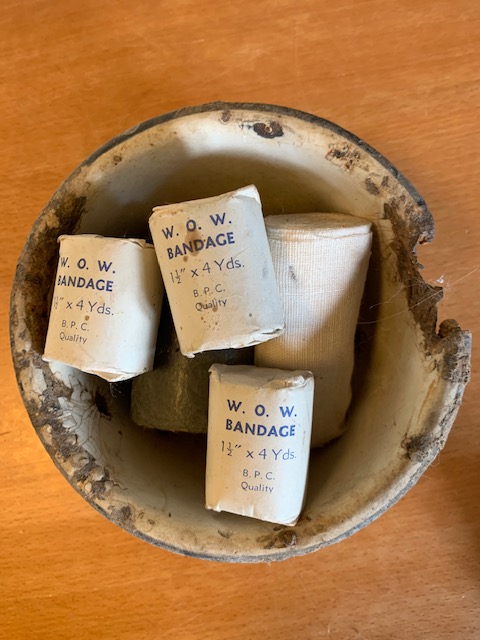 Over the years many parts of my body have been damaged: right hip, right shoulder, left leg, left wrist. Often as a result of my leg giving way or me tripping. The former is preferable as it can be quite elegant. In Sydney earlier this year (it feels like decades ago), I pirouetted to the floor, ending up sitting on the pavement facing back where we had come from. Last weekend I had a few falls and somehow seem to have cracked one of my left ribs. I have a pretty good pain threshold so according to current research I possibly don’t have any Neanderthal genes. https://www.upi.com/Science_News/2020/07/23/Neanderthals-may-have-had-a-weak-pain-threshold/5411595512792/ Luckily I have a Clipper medical assistant living with me so I asked for advice. Painkillers and strapping I was told (although strapping just keeps you from moving too much). Well, I’ve been wondering for years what to do with these WW2 bandages from my grandmother! (WOW stands for either white open weave or without woven edge).