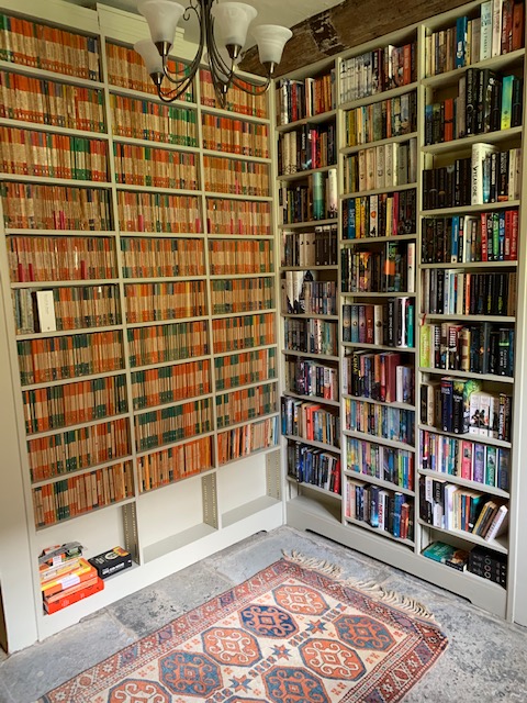 In the ‘library’ are my first 1000 Penguins (all but 14 or so). I was careless enough to lose my external hard drive with all the information about them (which ones are missing, which edition do I have, what colour: orange for general fiction, green for crime, blue for biography etc) so I had to sort them all out and record the information again. Whilst doing that I decided to tidy up all the other books, these are alphabetical, science-fiction / fantasy by author, except George and I keep buying and reading more so they were totally in a mess. So much better now!