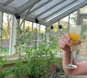 I made Midnight Passion, even though it was only seven pm, because I had a mango in the kitchen asking to be used. Mix 30 ml Limoncello (which I will tell you all about some other time), 30 ml mango (which I liquidised and estimated) in a champagne flute then fill up with champagne. What could be simpler? Apart from the mango, which separated out and looked like a dead orange aquatic creature. You can also see how the tomatoes are getting on.
