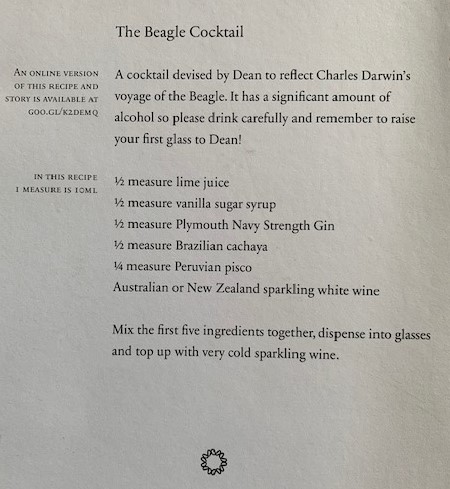 Finally, the Beagle cocktail. I’ve not made any this week due to being away but we have had this a number of times: it is VERY alcoholic but also very tasty. Dean came and made it for JD’s 60th (another link). I will make one for the coming weekend and raise a toast to Dean. The recipe is relatively self-explanatory, it links many places the Beagle visited.