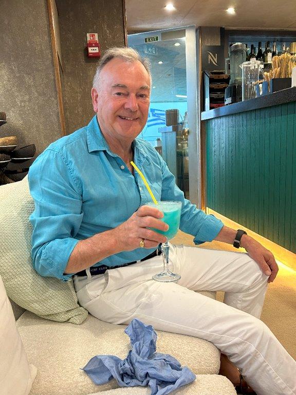 We didn’t neglect our cocktails, although the number of wines we’d sampled during most days meant we routinely missed the pre-dinner daily special. Fortuitously, the one we tried matched JD’s shirt: it consisted of pineapple, rum, coconut and blue Curacao.