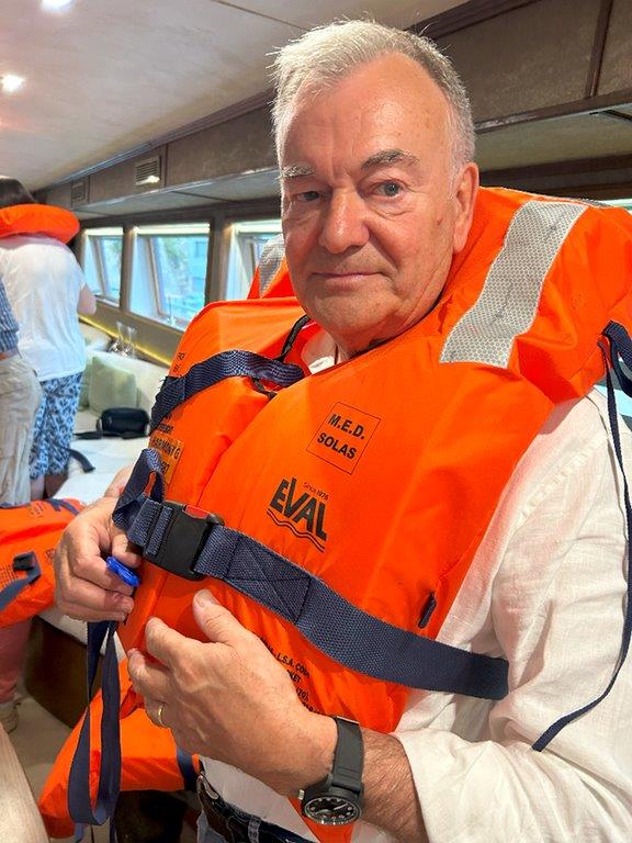 It can take up to 44 passengers but we weren’t full. As well as JD and I, there were sixteen other winos, sorry, wine enthusiasts, our wine host Tim and our tour manager Stella, making twenty of us, plus the 18-strong crew who looked after us and made sure no-one fell overboard. We moved from one destination to the next overnight mostly, so had the day for sightseeing and sampling. The first thing we do on a new boat is the life drill, so above you’ll find the obligatory photo.