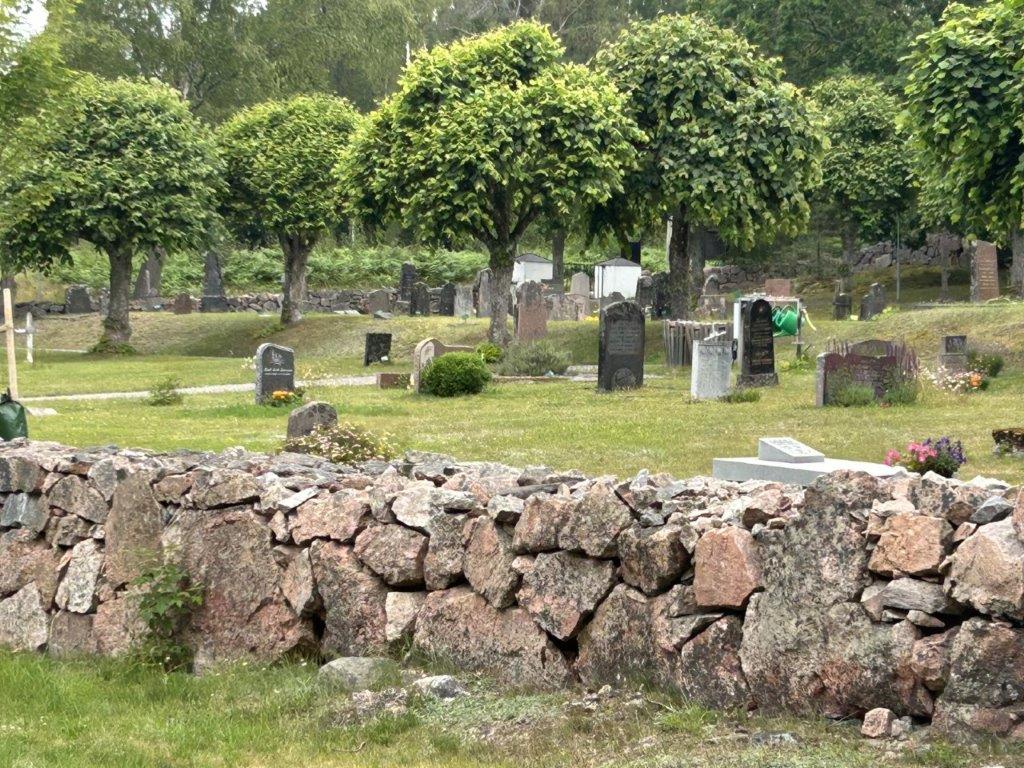 The next morning dawned grey and still. Once again we motored for the day, south through the archipelago towards a hint of light on the horizon. This was nothing but a mirage as we entered a region of ‘dimma’ or fog and lost sight of land for a while. With the help of modern instrumentation we found our next berth, a pontoon at Kyrkviken on the island of Orno. Here there was a church (locked unfortunately) with a pretty graveyard.