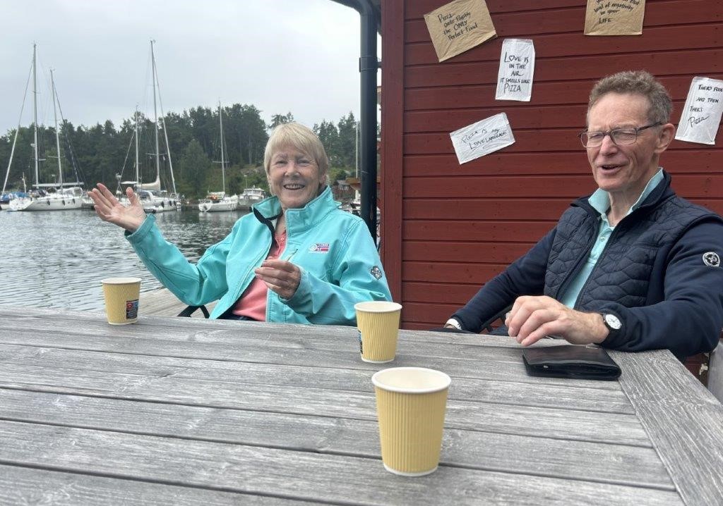 The next morning again dawned grey and still but with more of a promise of sun. Bird watching before breakfast, we saw a pair of Slavonian Grebes on the water, a bit too far away to get a decent photo. How come we hadn’t seen any in Slovenia? We bought some cinnamon buns to go with our mid-morning coffee and set off. JD managed to get a bit of helming in, but as he forgot his log book, Skipper Adrian could not add it to the Clipper distance.