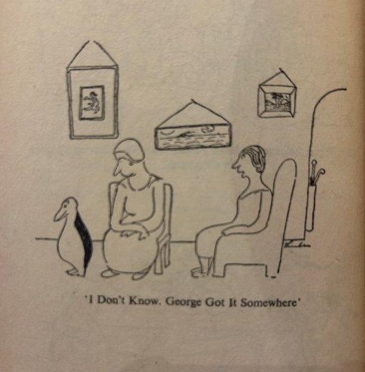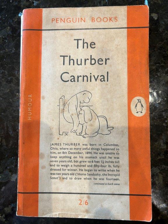 If you’ve never heard of Walter Mitty, he was the eponymous hero of a 1939 book by James Thurber, ‘The Secret Life of Walter Mitty’. I was given it this Christmas. A Penguin Modern Classic, at only 112 pages I should be able to make it my last book of 2025 (once I finish Dame Myra). Parts of it appear in one of my original Penguins, number 871, published in 1953. Too delicate to read, although it’s very tempting. I’ve given one of the cartoons which is quite appropriate for me, at the end of this Post. (Copyright James Thurber). The story was made into films, starring Danny Kaye in 1947 and Ben Stiller in 2013. If you’ve never heard of James Thurber, an American humourist, you might have seen some of his cartoons. Here’s a link to a few on this website; if I ever find myself in Ohio I think I’ll have to visit his house, which I’ve just learnt is now a museum.