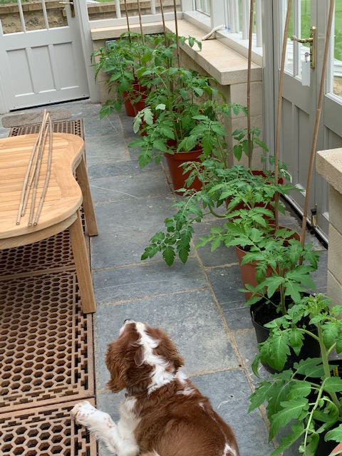 I have decided that there are (at least) four stages of early morning hair: normal, dragged through hedge backwards, Strewwelpeter (see Post 88 dated 18th April 2020) and now, the beginning of dreadlocks. How to have them (the lazy way): if you pretend to be a caveman (woman) and don’t comb or brush your hair, in about a year you’ll have wonderful dreadlocks. Hmm. Just think of the loss of weight we’ll all have once our hair is cut. That “Covid Stone” is nothing to do with our excess eating and drinking, it’s the hair! Or so we can tell ourselves for the next few weeks until the hairdressers open. In the absence of having my hair cut, I’m trimming anything I can lay my hands on: dogs, lupins, roses, tomatoes. Another reason for OBB to leave? I did enjoy my day alone but probably due to the novelty.