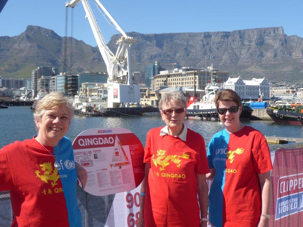 Last night we heard that, due to infringement of the rules on how close to the coast they can sail, Punta del Este had a six-hour penalty imposed. If you go back to the times above, you will see that this meant they were actually placed fourth and Unicef promoted from third to second! Our first double Dawson podium one-two (first of many we hope, with Unicef allowed to beat Qingdao some of the time). It was extra special as two of George’s Godparents plus a very good friend from Somerset had joined us in Cape Town. Here are three of the groupies!