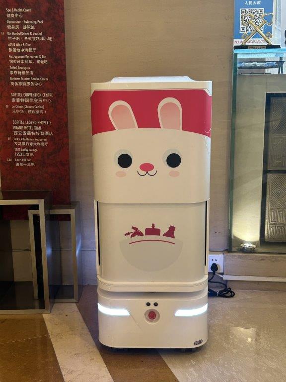 How could you not want to stay there? Our room had one of those infernal modern toilets. I am not going to install them at home. What happens when you have a power cut? While we were waiting for the two hotels to be compared, I spotted an odd thing in the lobby. A food delivery robot! So cute, I was tempted to order something just to have it arrive at my room and take delivery.