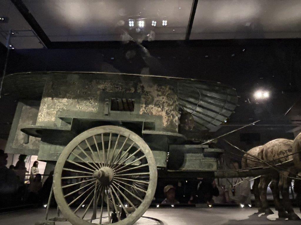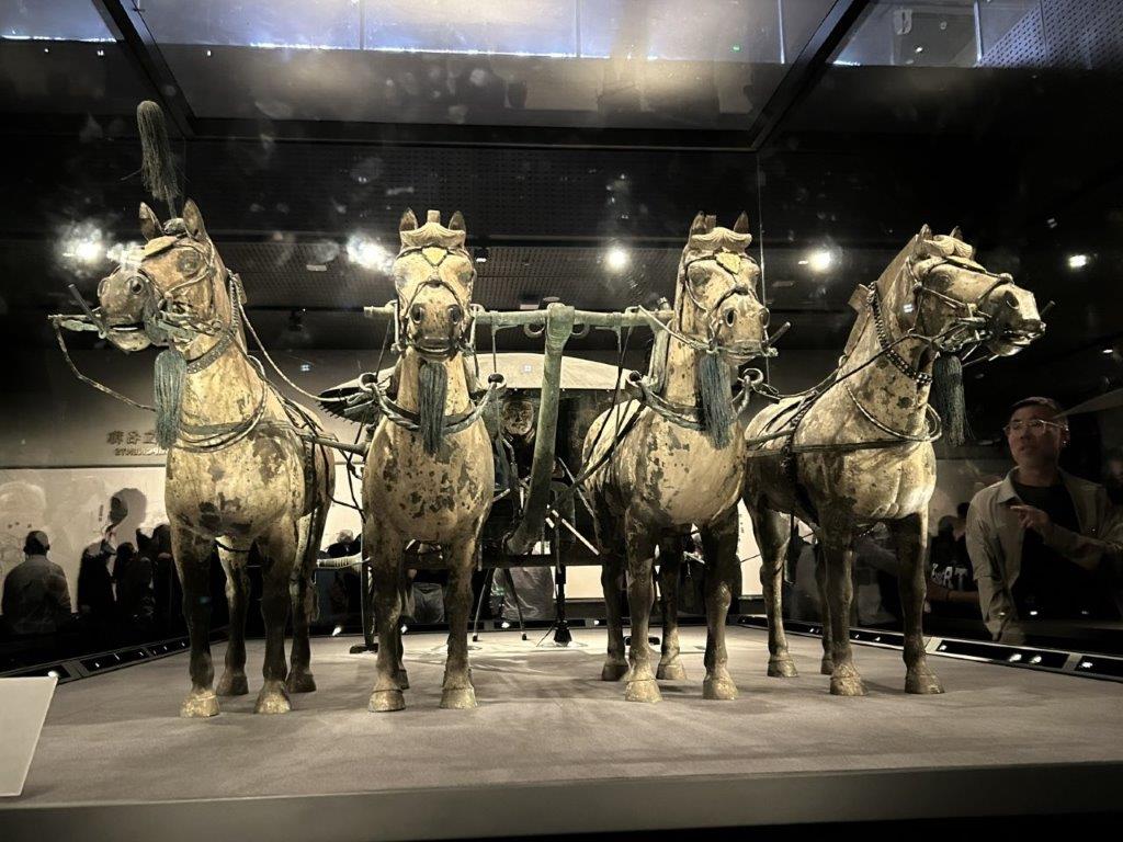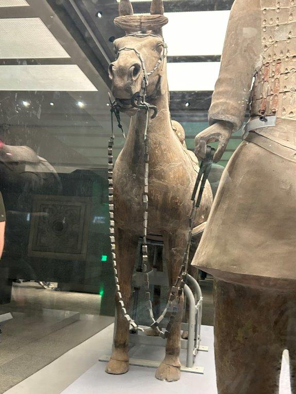 To see the real place is just incredible. If you look carefully at the photo above you can see the visitors lining the walkways above and get a sense of scale. It’s still being explored: I’m not sure how much they want to excavate. The tomb itself has not been opened. It contains a tonne of mercury (detected by modern non-invasive methods) which would cause havoc if exposed and is reported to be booby-trapped. As well as the warriors, acrobats and wrestlers found early on, they have uncovered musicians, animals and birds. A whole kingdom for the Emperor to rule after death. Before we got to the actual warriors, we saw the bronze carriage with horses that had been built for the Emperor in the afterlife. The reins had decayed but otherwise it was in perfect condition. (Further down you can see a horse being led, where the reins were made of silver and so survived).
