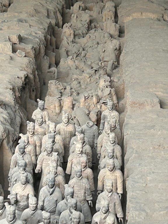 The whole site had originally had thatched roofs, which over time collapsed and crushed a number of the statues, as you can see. Restoration of each one can take three years or more: early restorations were not so sympathetic, but they have been kept to show the progression of such work. Equally, there had been tomb robbers in the earlier days, so although the soldiers look like they should be carrying weapons, only a few have been found.