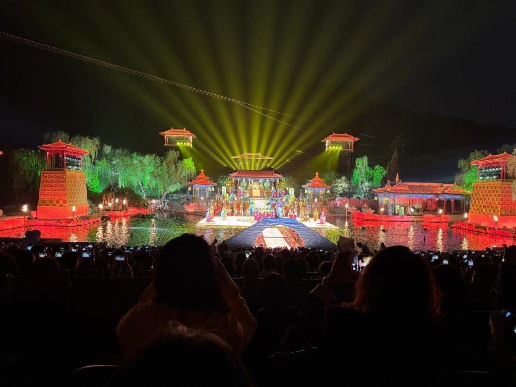 The day was not finished as we then strolled through the gardens of the hotel-restaurant past the hot springs, led by a man with a lantern, to our seats in a 3000-seat arena to watch a show. This was entitled The Song of Everlasting Sorrow, based on the tale of Emperor Xuanzong and his favourite concubine Yang Yuhuan. A spectacle well worth seeing, even though we could not understand the commentary. George gave us a very brief synopsis, enough to keep us going. Emperor meets girl, falls in love, neglects his Emperor-y duties, faces a rebellion, puts her to death for the good of the country, spends the rest of his life in mourning until they are re-united as a phoenix and dragon in heaven.