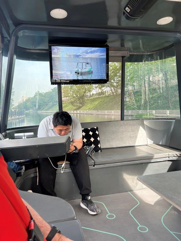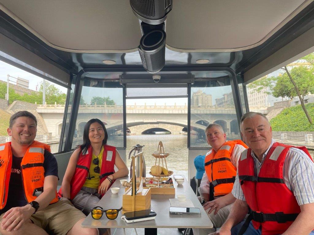 After all this excitement, the next day I relaxed by the hotel pool. Even though I had spent most of the previous day being pushed in a wheelchair (good exercise for the others) I felt tired and not inclined to walk or be pushed around for a second day. Y joined me as she’d been working all morning. By the afternoon we were ready to go out, so met JD and G (this was the day they Walked the Wall) by the moat and hired a boat. We understood it to be self-driving, but like the cars, it’s not yet trusted to look after itself. It couldn’t go very far but was fun anyway.